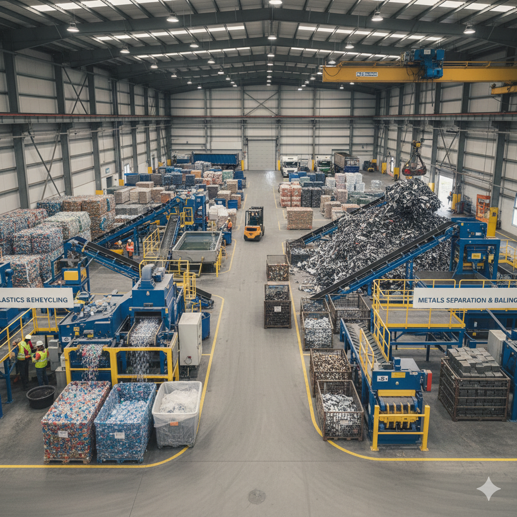 Systematic recycling of plastic, aluminium, copper, iron, and steel.